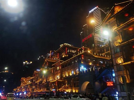 夜幕下的重慶變成黃色,洪崖洞的建筑在燈光的輝映下,像極了動畫片里的畫面,看過動畫片《千與千尋》的朋友,應該會感覺到非常的眼熟。晚上的洪崖洞五光十色、光怪陸離,站在馬路對面,可以看到整個洪崖洞建筑的全景。靜下心來,周遭的一切都不存在,仿佛進入到了動畫里。