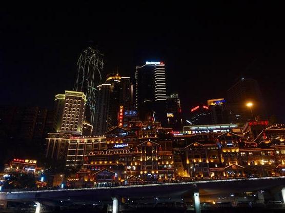 洪崖洞一共有11層,夜晚燈光是從晚上6點開燈,10點熄燈。夜晚燈光亮起的時候,堪稱山城一絕。夜幕降臨,洪崖洞吊腳樓被燈光環繞,像鍍了層金,化身為重慶的金色名片。